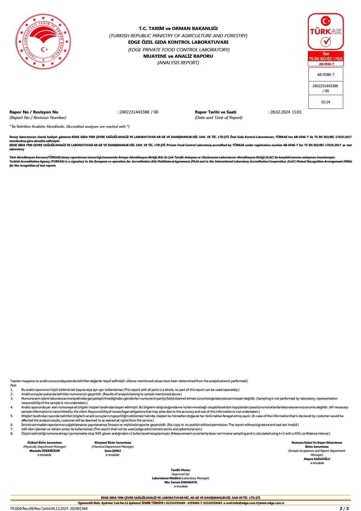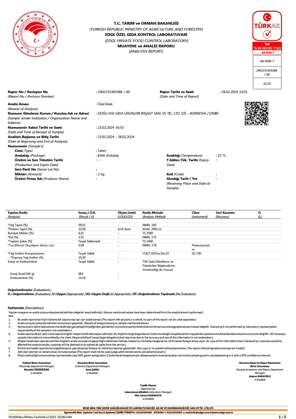 Doğu Ege Manisa Tahin Analiz Sonucu
